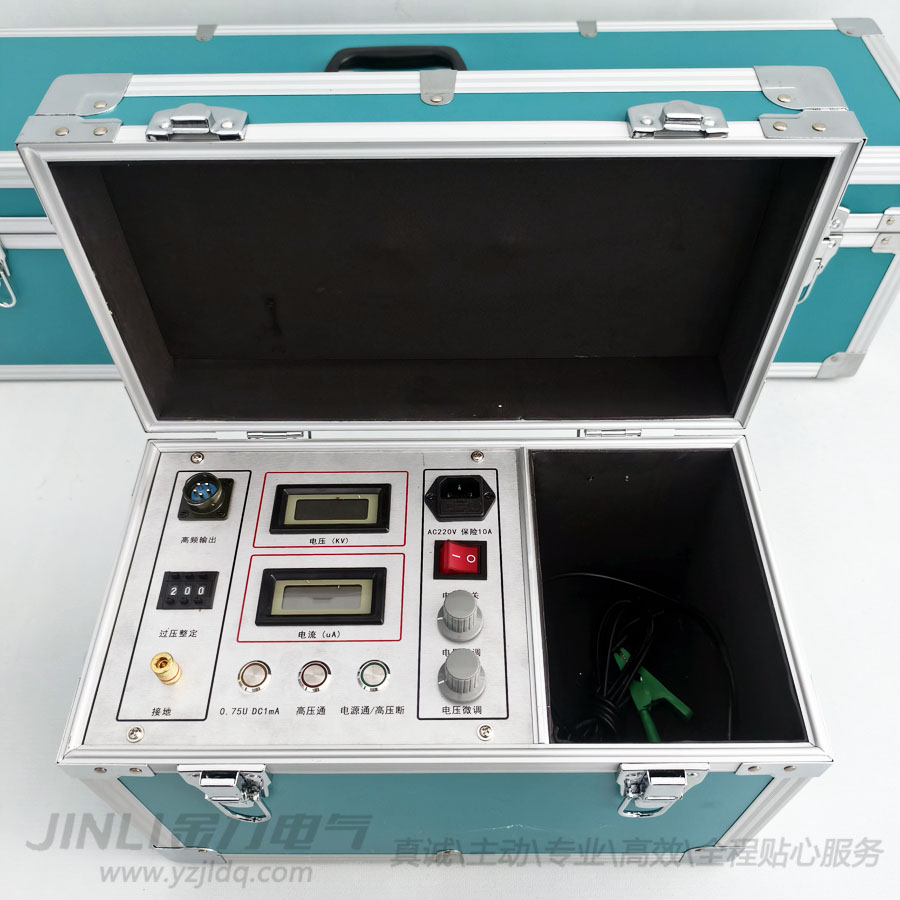◆ 增設(shè)了高精度75%VDC-1mA的功能,做氧化鋅避雷器測量帶來極大的方便。輕輕一按無須計算。本儀器控制箱上有75%的電壓功能鍵,在做避雷器試驗時,當電流升到1000uA時、就按下0.75UDC--1mA的按鈕,這時電壓表、電流表所顯示的值就是75%的數(shù)據(jù),做完后應立即將調(diào)壓電位器回到零位上,并應立即按綠色按鈕,切斷高壓并關(guān)閉電源開關(guān)。再做其它的試驗。